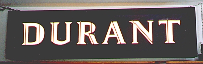 ![]() F-00-0105-1 – Durant; age unknown; single sided; lighted; raised letters and border; acid etched glass, 9½” by 27½”. Possibly a window sign, or for an Auto Show |